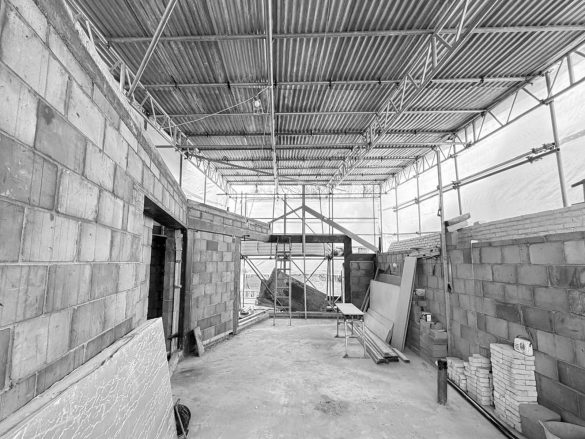 We visited site today to review the progress of our Phase One extension design. Significant progress is being made, with the blockwork well underway, rooflights being installed and the steels incorporated in line with our drawings and the engineer’s specified positions. The building shown on site when finished will explore a trapezium based geometry beneath a gable roof, allowing the external brickwork façade to continue seamlessly throughout, where internally it will be a snug, WC and bedroom for the client.